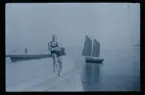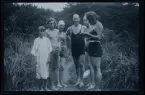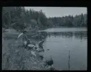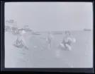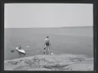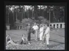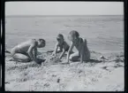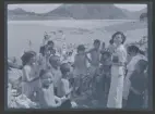 Män står en servering på en badstrand. En surfingbräda står lutad mot hyddan av flätade palmblad.