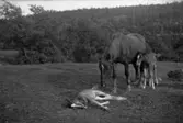 Enligt noteringar: "Hästar. T.v. smedjan, t.h. gamla bostadshuset och en skymt utav ladugården Kville Västergård, Skistad. Gården kallades i folkmun "Kyrkehee."