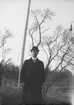 "Agda på Kanaludden. 13/4 1913." Kvinna i jacka och hatt med handskar, hållande en käpp, utomhus.