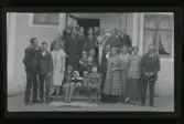 "Hos familjen Gustavsson, Hvilan Katrineholm." Grupporträtt. Kvinnor, män och barn poserar på trappan till ett hus.