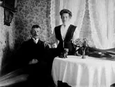 ETT PAR SITTER VID ETT BORD I FINRUMMET.