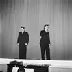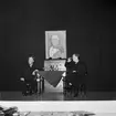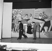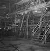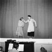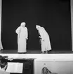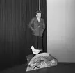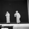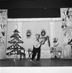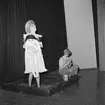 En kvinna stående på en scen iklädd kjol med tillhörande liv förkläde och huvudduk, I handen en skära och under armen det hon skördat. På scengolvet ligger mera hö (?) och i bakgrunden en fond med ett fält med gröda och två hus och några tallar om syns i fjärran.