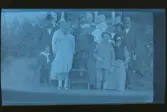 "Anna och Per Eklind Husby." Grupporträtt. Kvinnor, män och barn poserar på trappan till ett hus.