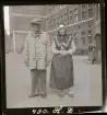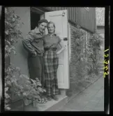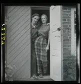 Målare Gustaf (?) och fru står i en dörröppning och håller om varandra. Mannen iklädd basker och sandaler, kvinnan i ledigt skurna rutiga byxor. Viken, Skåne.
