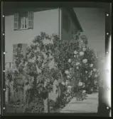 Boningshuset vid gården Mon/Mohn. Nio personer framför huset.
