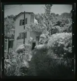 Mor Sigrid med dottern Irene, Kollabo, Kinnared står invid höga blomster, möjligen stormhattar. I bakgrunden ett fält, stenröse och höga träd.