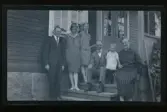 "Fallet, familjen Karlsson." Grupporträtt. Kvinnor, män och barn poserar på trappan till ett hus.