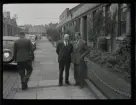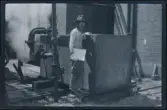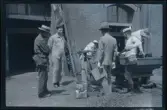 Gruppbild på 6 garveriarbetande män, uppställda på rad framför Brunos Garver i kv. Hjulet vid Lugnet.