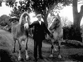 EN MAN KÖR SLÅTTERMASKINEN MED ETT PAR OXAR.
