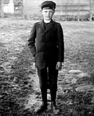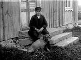 TVÅ MÄN UTOMHUS, DEN ENA KLÄDD I FINKLÄDER, DEN ANDRE ARBETSKLÄDD. BONDE OCH HERREMAN.