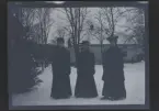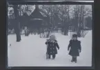 Flickorna Morthensen i snön, på skidor och med kälke.