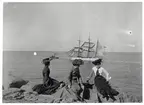 "Utfärd till Vinga med ångfartyget Ejdern. Damerna fr v är Gina Petersson, Lilly Pettersson och Ester Almén, moster, mor och faster till Dag Almén, son till fotografen som är Viktor Almén. Fototillfälle 18.9 1904"