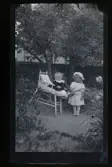 "Björklunda" Porträtt av två barn ute i en trädgård. Det minsta barnet sitter i en barnstol på hjul/ barnvagn.