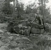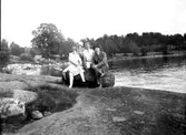 Christiane Liljefors med sina barn, Alf, Roland, Ingemar och Marit, uppe på berg, i bagkrunden ett sjölandskap, sannolikt i Sverige