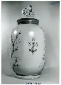 "(?)svalls Segelsällskaps 70-årsjubileum". Bojan från Bo Fajans, formgivare Eva Jancke-Björk, 1900-talets mitt. Dekorerad med ett ankare och rep samt initialerna GSS, omgivet av långt sjögräs med små fiskar. Locket är dekorerat av en skulpterad och målad fisk.