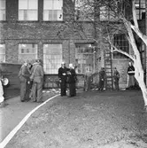 Brandskyddsövning på Papyrus, den 30/9-1958. 1 John E. Lisshammar, Mölndals-Posten, 2 okänd, 3 okänd, 4 ingenjör Wiggo Odenius, 5 överingenjör William Tibell, vid brandbilen? Åskådare maskinmästare Joho Jakobsson.