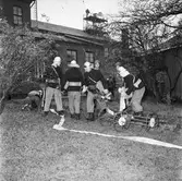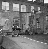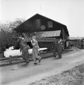 Brandskyddsövning på Papyrus, den 30/9-1958. Urban Lundin, Anders Stenberg bär båren tillsammans med Olle Johansson.