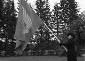 "Luftskyddets dag. Stort intresse bland Upsalaborna" - Karin Bratt med Uppsalaortens Luftskyddsförenings nya fana, Studenternas Idrottsplats, Kronåsen, Uppsala 1942