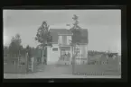 Tvåvånings bostadshus med förstubro, 10 personer framför huset. Aug. Vädd