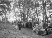 Medlemmar i Upplands fornminnesförening på väg till Billhamn under föreningens vårutflykt till norra Uppland. Längst till höger föreningens sekreterare bibliotekarie Oskar Lundberg