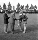 Götberg skall leda idrottsplutonen, ÖSK - Bäckman 11 april 1967 Fotbollspelare spelar på Trängens fotbollsplan. På läktaren sitter det publik, och nedanför står det mer publik.