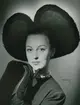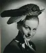 "Hatt använd vid Franska avd. uppvisning". Modell, möjligen Hjördis Grundel-Starenius, i platt, liten hatt, två stora fjädrar, flor.