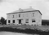 Frisersalong i Mölndals Kvarnby, troligtvis 1900-1910. Från vänster står möjlig kund, Henriksson, Widgren och tvålpojken Nils Engberg.