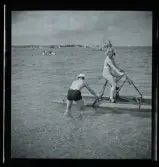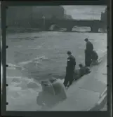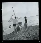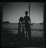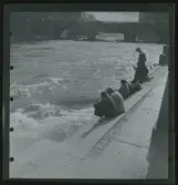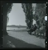 Ett par sitter på en bänk vid en kaj/ strandpromenad.