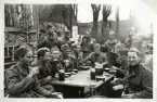 "Regstaben utspisas". En grupp karlar i uniform har slagit sig ner för utspisning utanför ett bostadshus med glasveranda.
