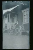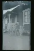 En kvinna med ett barn på armen står vid ett ålderdomligt hus med halmtak. Barnet bär basker. Längs husväggen står två späda lönnar i vildvuxen grönska. 1890-tal.