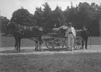 Man och kvinna i en vagn dragen av en häst på en grusväg i lövskogsmiljö. Björsgård.