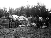 TVÅ MÄN HARVAR MED HJÄLP AV OXAR OCH EN HÄST.