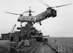 Bilden föreställer en så kallad flygande banan - en helikopter typ Vertol 44 under flygning omgiven av flera örlogsfartyg.