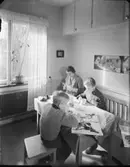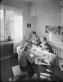 "Husmor med barn i hemmiljö" Pojkrum med en pojke som ordnar med sin frimärkssamling Interiör