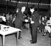 Skara. Bordtennis; DM i Läroverkets gymnastiksal 27/3 1955, prisutdelning.