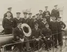 Officerare ombord på pansarskeppet SVERIGE 1939: fr v kapten A. O. J. Falkman, Chefen för kustflottan konteramiral Gösta Ehrensvärd (1885-1973), kapten B. Bertelsson (1902-1977) och kommendör Helge Strömbäck (1889-1960).