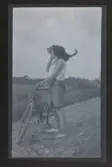 Ingrid Andersson (1918 - 2001, gift Skansing) står med en cykel ute i naturen, Livered "Majas"cirka 1940.
