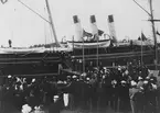 Bilden visar en småbåt som är lastat med varor och fyra män på väg mot Fylgia. Där har man fällt ut en landgång och tre besättningsmän är beredd att ta emot båten.