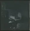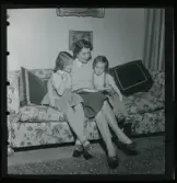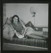 513 D Spooners Hemma hos redaktör Karlströmer. Kvinna sitter och läser framför hemmets bokhylla.