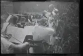 Tonårsmodevisning i Kungsträdgården i Stockholm, Nordiska Kompaniet. Orkester spelar musik.