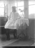 Tre pojkar (bröder?) samlade runt ett pelarbord i en trädgård, ca 1910. Till höger syns en mindre kuliss av trä med en blomsterurna m.m.