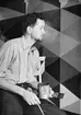 Frimärksavdelningens "Nordenrum" på 1 tr. Restaurering av bjälklag med målningar från omkring år 1640. Arbetet utförs här av anställda hos konservator Sven Dalén. Bjälkarna låg gömda under golvet till rum 3 på 2 trappor och upptäcktes vid rivningsarbetet. Fönster mot Kåkbrinken.
