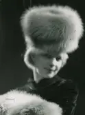 Nordiska Kompaniet. Kvinna i mörk pälskappa med stor krage av räv. Text på baksidan: "Breitschwantz med infärgad räv".
