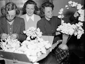 "Vårfestblomman slår ut" - studenter med vårfestblommor som de ska sälja på vårfestdagen i Uppsala maj 1945