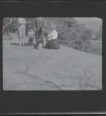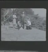 Ett sällskap vuxna och barn fikar utomhus.
