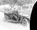 En bil står parkerad på den kullerstensbelagda Brahegatan i Gränna. Bilen har två små flaggor i fronten. I framsätet sitter en man och en kvinna och i baksätet två män och två kvinnor. Kvinnan till höger står möjligen utanför på fotsteget. Någon av männen är troligen kantor Henning Johansson från Barkeryd.