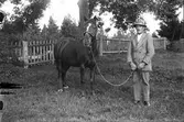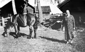 Häljesgården. Erik Gustavsson ställer in hästen i stallet år 1954.