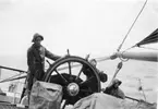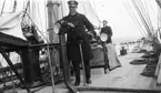 Bild tagen längs med Jarramas reling. Fartygschefen syns en bit bort i bild.