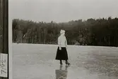 Sex skridskoklädda personer befinner sig på en frusen sjö (troligtvis Färåstjärn/Bergsjön) i Kållered, 1920-tal. En utav dem sitter på en skrinda.
