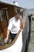 Passagerare i motorbåt med upprullat kapell väntar på slussning.